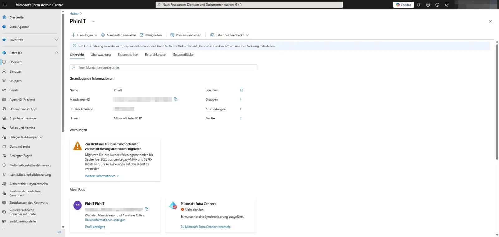 deine-firma.de), die für neue Benutzerkonten verwendet wird. - Warnungen & Hinweise: Anders als auf dem Dashboard siehst du hier oft operative Warnungen, wie z. B. die Aufforderung zur Migration veralteter Authentifizierungsmethoden (Legacy MFA) bis zu einem bestimmten Stichtag.