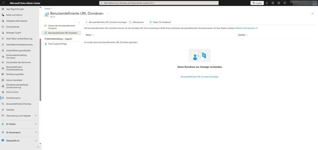 Neben dem Reiter für die Namen findest du oft den Tab „Benutzerdefinierte URL-Domänen“. Viele Admins wundern sich, dass dieser leer ist (Anzeige: „Es wurden keine benutzerdefinierten URL-Domänen gefunden“). Das ist im Standardbetrieb völlig normal.