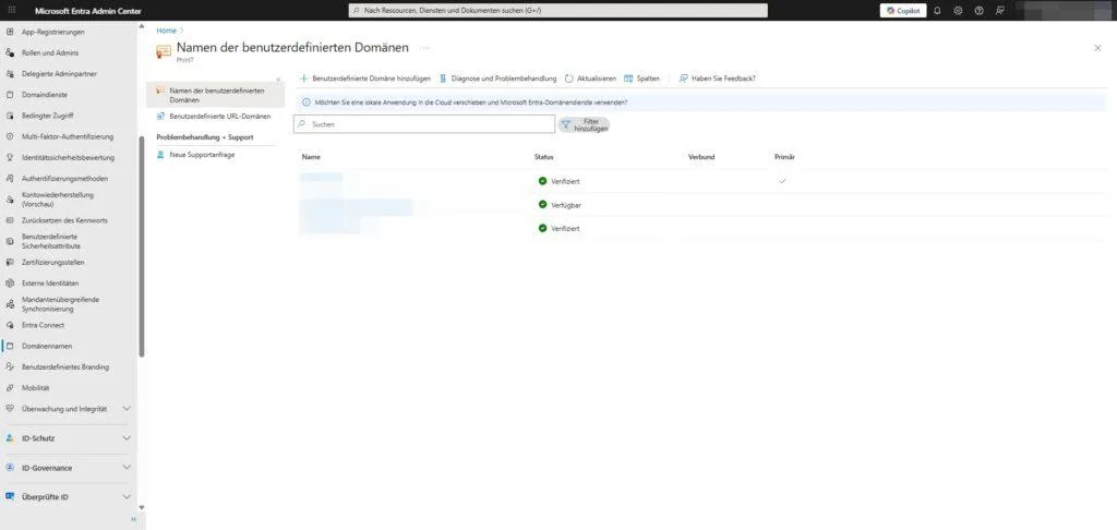 - Status prüfen: Sollte es Probleme beim Mail-Empfang (Exchange Online) oder bei der Anmeldung geben, ist dies die erste Anlaufstelle. Prüfe, ob der Status auf „Verifiziert“ steht und alle erforderlichen DNS-Einträge für die Dienste (M365, Intune etc.) korrekt erkannt wurden.