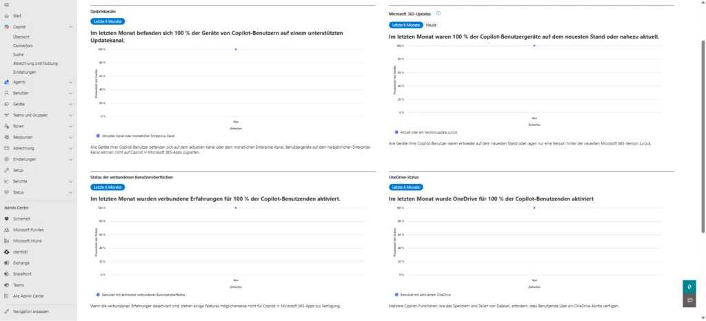 - OneDrive-Status: Da essenzielle Copilot-Funktionen wie das Speichern und Teilen von Dateien auf OneDrive basieren, ist ein aktives OneDrive-Konto für jeden Nutzer zwingend erforderlich. Das Dashboard gibt dir Aufschluss darüber, bei wie vielen lizenzierten Nutzern dies bereits der Fall ist.