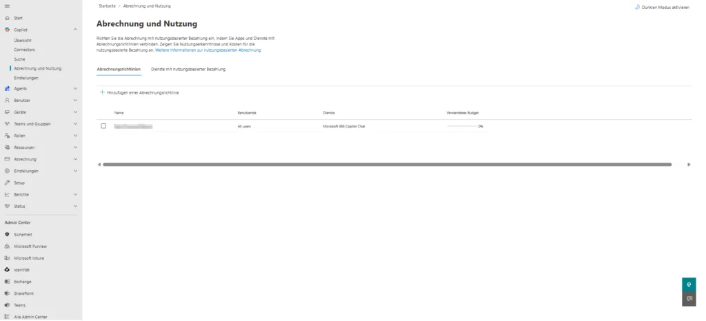 - Microsoft 365 Copilot Chat: Hier wird überwacht, welche Kosten durch die Nutzung der Chat-Funktionen entstehen, sofern diese über eine nutzungsbasierte Richtlinie laufen.