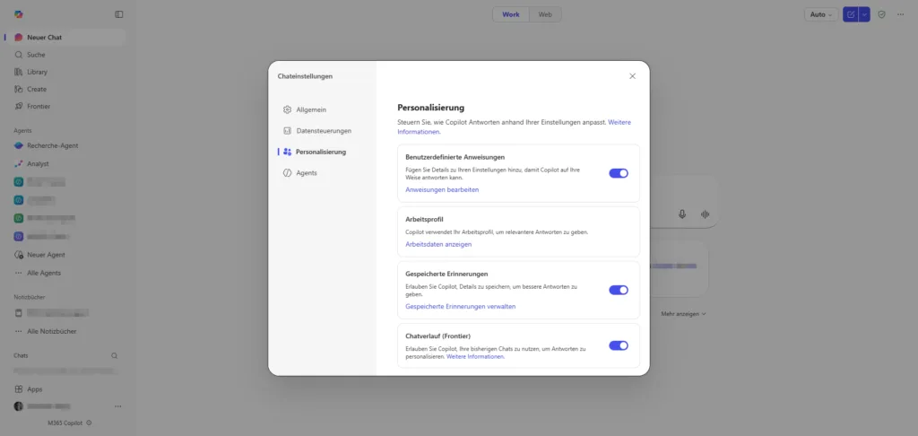 Bedeutet: Die Daten werden verschlüsselt, nicht dauerhaft gespeichert und nicht zum Training der globalen KI-Modelle verwendet. In dieser Version hat die KI jedoch keinen Zugriff auf deine Dateien im Microsoft Graph oder interne Unternehmensdaten. - Microsoft 365 Copilot (mit Lizenz): Dies ist die Vollversion. Sie bietet die tiefe Integration in die Office-Apps und nutzt den Microsoft Graph, um aktiv mit deinen Organisationsdaten zu arbeiten. Ein klares Erkennungsmerkmal für lizenzierten Nutzer ist der Reiter "Work" innerhalb der Copilot-Chat-Oberfläche. Dieser signalisiert, dass die KI nun autorisiert ist, Informationen aus dem geschäftlichen Kontext (Mails, SharePoint etc.) zu verarbeiten. Hier gelten dieselben strengen Compliance- und Sicherheitsrichtlinien wie für den gesamten Microsoft 365 Tenant.
