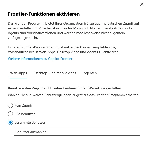 Im Reiter Benutzerzugriff steuerst du, wie Copilot in verschiedenen Schnittstellen deines Unternehmens erscheint und wer Zugriff auf spezielle Vorschau-Funktionen erhält. Hier legst du fest, ob Benutzer eigenständig Lizenzen erwerben können und wie tief die KI in die Administrator-Oberflächen integriert wird.