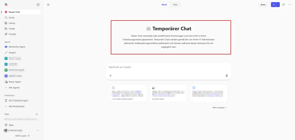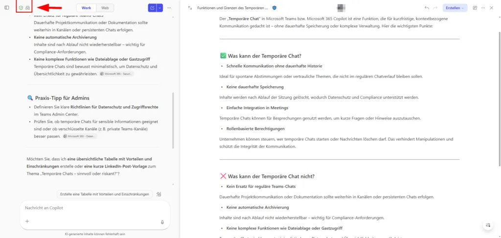 Technisch gesehen ist der temporäre Chat eine Sitzung, die isoliert vom persistenten Speicher des Copiloten läuft. Er ermöglicht Dir, mit der KI zu interagieren, ohne dass die Konversation im Verlauf („Conversations“) abgelegt wird. Das ist besonders relevant für Ad-hoc-Anfragen, die nicht Teil Deines langfristigen Arbeitskontextes werden sollen.