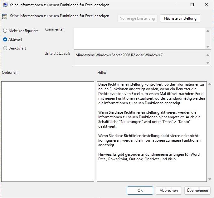Einstellung: „Neuheiten“ / „Keine Informationen zu neuen Funktionen anzeigen“ -> Aktivieren.