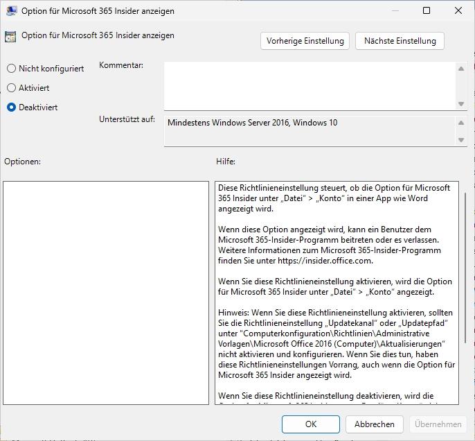 Einstellung: „Optionen für Microsoft 365 Insider anzeigen“ -> Deaktiviert.