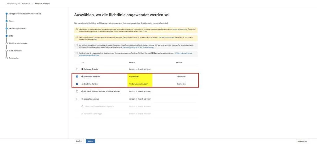Tipp: Wenn du im Purview Portal Regeln baust, wähle als Speicherort SharePoint-Websites (für Teams Kanäle) und OneDrive-Konten (für Private Chats). Lasse den expliziten Haken bei „Teams-Chat- und Kanalnachrichten“ weg, sofern du keine E5-Lizenz hast, da die Policy sonst oft gar nicht speichert oder Fehler wirft. Wir schützen Teams hier „indirekt“ über den Speicher-Layer!