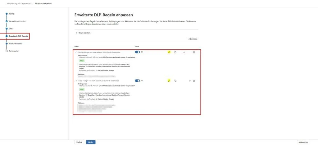 - Zur Regel navigieren: Klicke im Wizard auf „Weiter“, bis du zum Punkt „Erweiterte DLP-Regeln“ kommst.