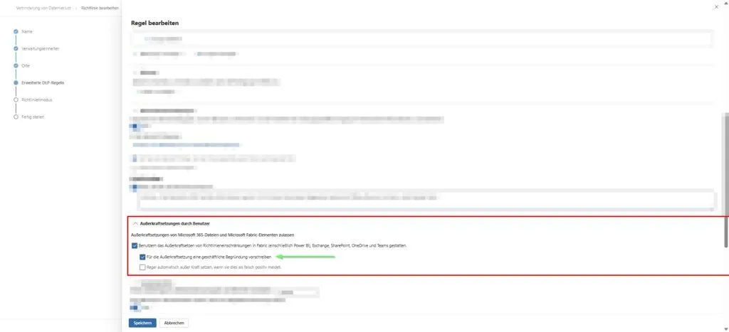 Die Konfiguration der „Psychologischen Schranke“: Im Regel-Editor der DLP-Policy findest du unterhalb der Aktionen den Bereich für Außerkraftsetzungen.