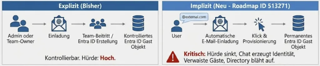Zwar respektiert der Prozess deine globalen Entra ID External Collaboration Settings (B2B-Richtlinien), aber er demokratisiert die Erstellung von Gästen auf die Ebene einer simplen Chat-Nachricht herab.