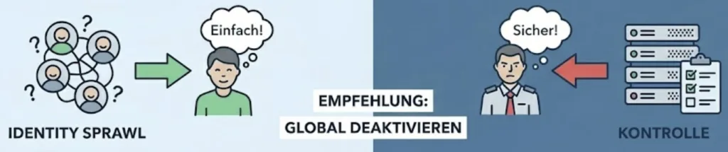 Obwohl Microsoft dieses Feature vorrangig für SMB-Kunden (Business Basic/Standard) entwickelt hat, wird es auch in Enterprise-Tenants standardmäßig aktiviert („Enabled by Default“). Um einen unkontrollierten Anstieg von Gast-Identitäten (Identity Sprawl) zu verhindern, ist proaktives Handeln erforderlich.