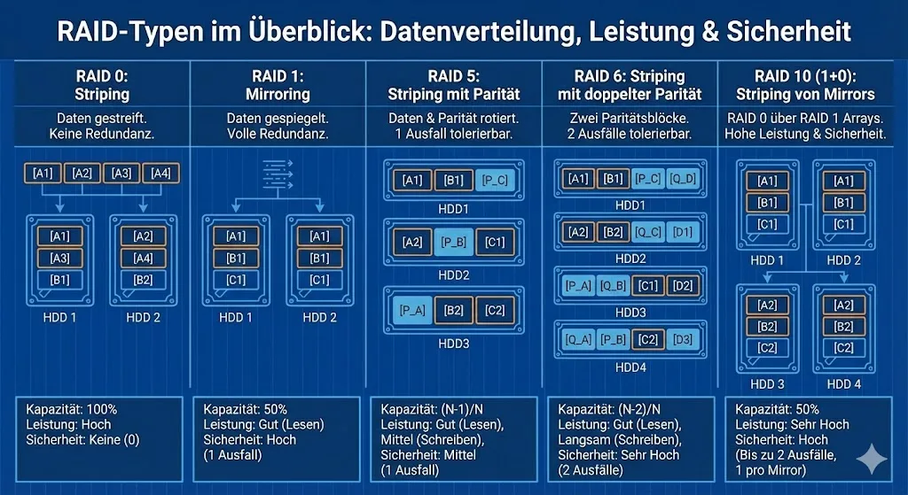 RAID ist das Fundament der Verfügbarkeit. Für moderne Server gilt meistens folgende Faustformel: Brauchst du Platz? Nimm RAID 6 (wegen der Sicherheit bei großen Platten). Brauchst du IOPS/Speed? Nimm RAID 10. Vermeide RAID 5 bei kritischen Systemen und SSDs, wenn möglich, und vergiss niemals: Das RAID hält den Betrieb am Laufen, aber nur das Backup rettet dein Leben.
