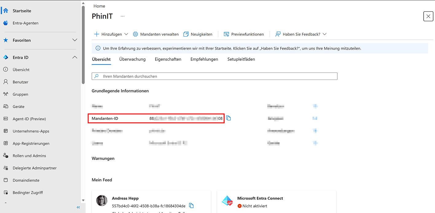 Du benötigst die eindeutige ID Deines Microsoft 365 Tenants. Diese findest Du am schnellsten im Microsoft Entra Admin Center.