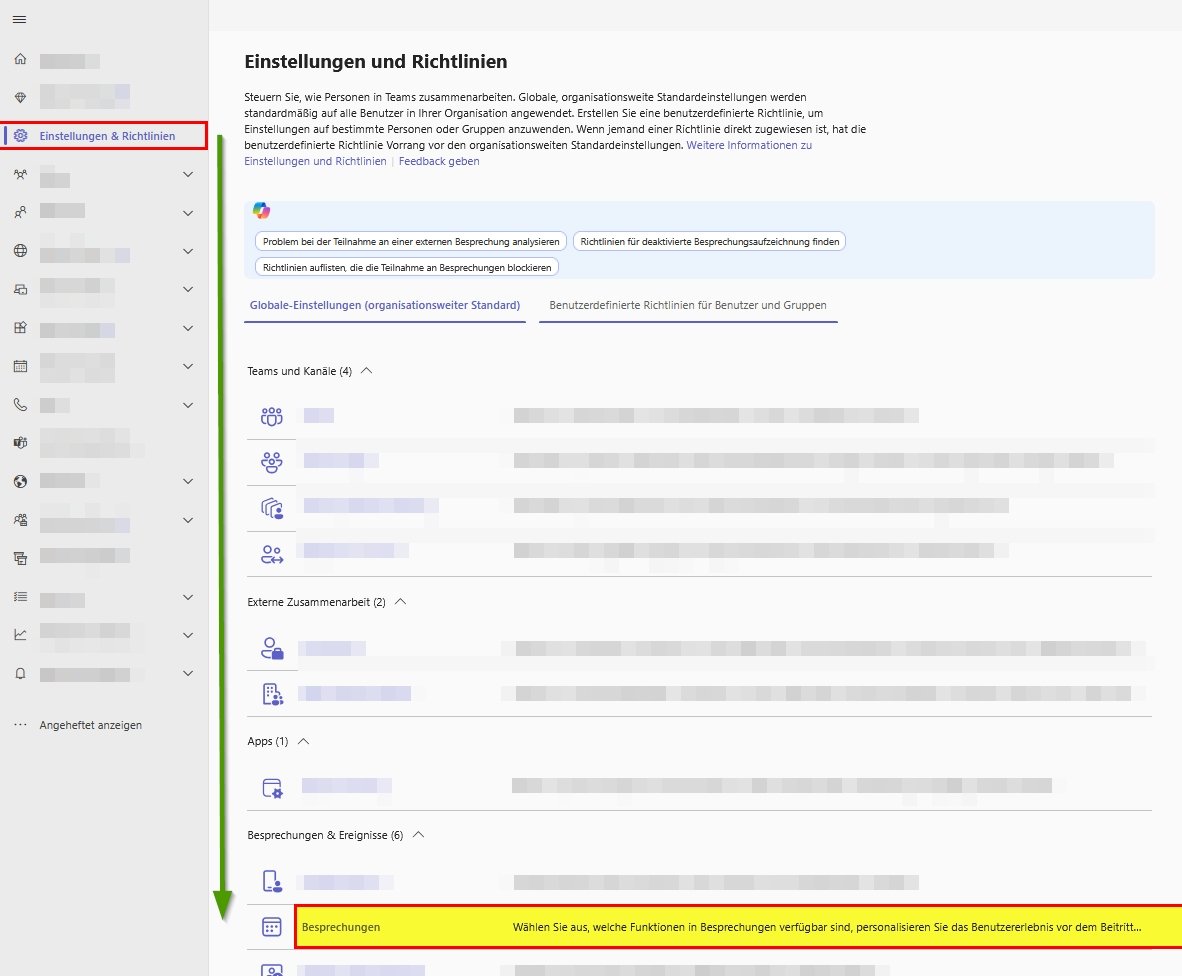 - Navigiere zu Einstellungen & Richlinien > Besprechungen > Besprechungseinstellungen.