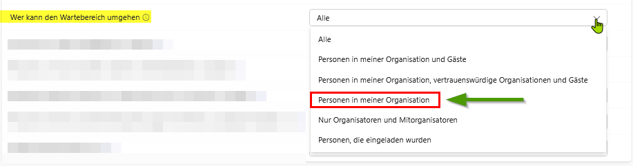 - Prüfe unter Besprechungsteilnahme und Wartebereich die Option „Wer kann den Wartebereich umgehen“.