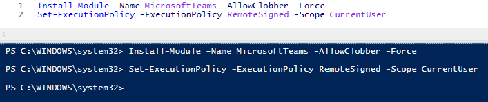 Install-Module -Name MicrosoftTeams -AllowClobber -Force