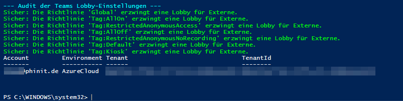 Set-ExecutionPolicy -ExecutionPolicy RemoteSigned -Scope CurrentUser2. Audit der Lobby-Einstellungen (Die Prüfung)