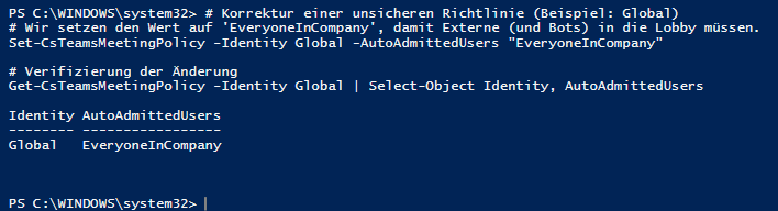 Get-CsTeamsMeetingPolicy -Identity Global | Select-Object Identity, AutoAdmittedUsersDurch diese Abfolge -> Installation, Audit und gezielte Setzung - verlässt Du Dich nicht auf die Standardeinstellungen von Microsoft, sondern gestaltest Deine Sicherheitsarchitektur aktiv. Die technische Notwendigkeit ergibt sich aus dem Risiko des unkontrollierten Datenabflusses: Ein Bot, der die Lobby umgeht, beginnt sofort mit der Aufzeichnung. Mit diesen Schritten stellst Du sicher, dass der "Gatekeeper"-Moment der Roadmap 558107 in Deinem Tenant auch tatsächlich stattfindet.