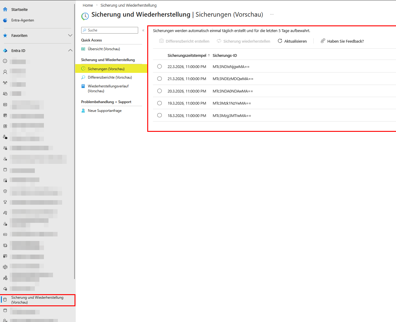 Ein entscheidender Design-Faktor ist die rollierende Speicherung von exakt fünf Tagen. Diese extrem kurze Vorhaltezeit dient primär der unmittelbaren Disaster Recovery bei administrativen Fehlkonfigurationen. Wenn ein Administrator aus Versehen die MFA-Ausnahme für Break-Glass-Accounts entfernt, droht der vollständige Ausschluss des IT-Teams. Mit dem nativen Backup hältst du einen fixen Wiederherstellungspunkt bereit, wodurch die fehlerhafte Policy durch den funktionalen Zustand vom Vortag fehlerfrei überschrieben wird.