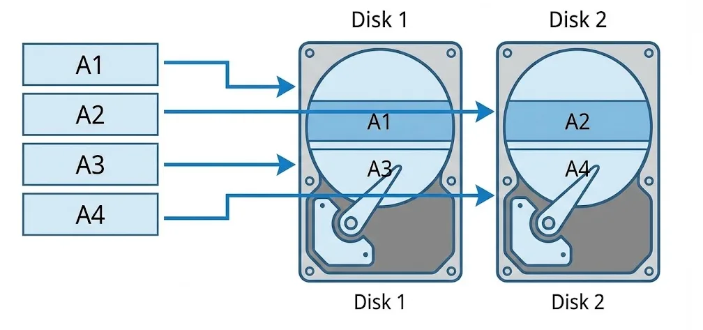RAID 0 verteilt Datenblöcke abwechselnd auf alle verfügbaren Laufwerke ("Striping"). Es gibt keine Redundanzinformationen.