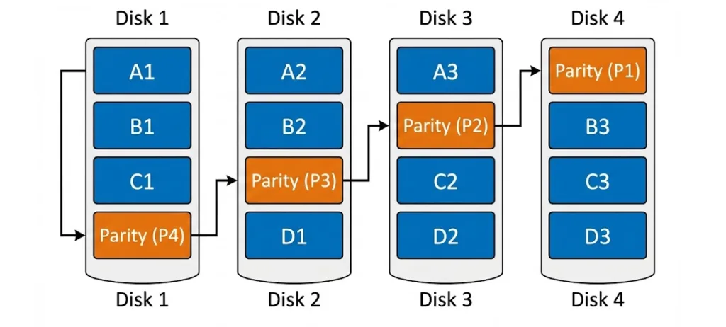 RAID 5 nutzt Striping mit verteilter Parität. Daten und Prüfsummen (Parity) werden über alle Platten rotiert. Fällt eine Disk aus, errechnet der Controller die fehlenden Daten aus der Parität der verbleibenden Disks.