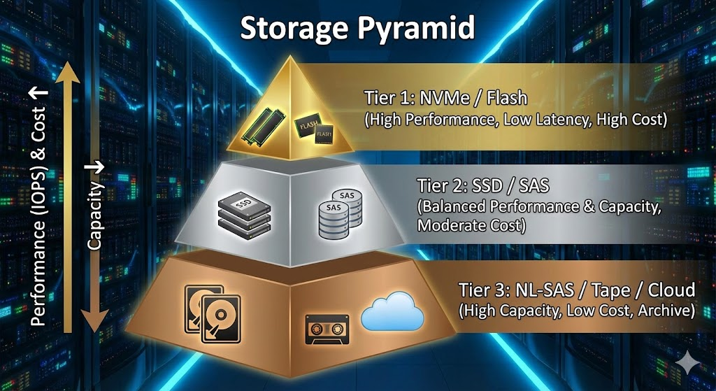 | Typical use-case | boot drives, single servers, local caches, isolated test systems. | File servers, user homes, backups, archives, media streaming. | Virtualization (VMware/Hyper-V cluster), ERP databases, mission-critical apps. |