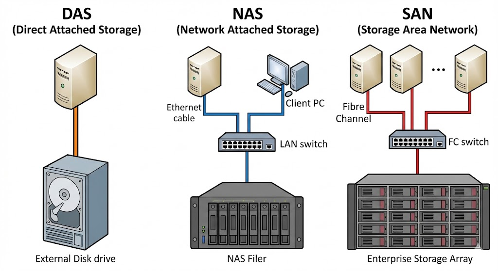 | Concept | 1:1 connection. The memory is directly connected to the server (internal or by cable). | Storage is provided in the LAN (Ethernet). A specialized "filer" shares data. | Dedicated high-performance network (Fibre Channel or iSCSI) for storage traffic. |