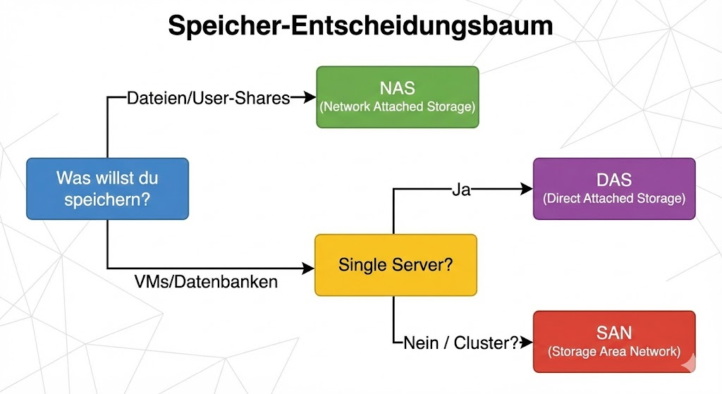 Note: The boundaries are becoming increasingly blurred. Modern NAS systems (such as those from Synology or QNAP) often also offer iSCSI targets (block level over LAN) and thus act as "mini-SAN" for small clusters. Conversely, enterprise SANs often offer NAS (unified storage) head units. For the architecture decision, however, the key question remains: Do I need shared files (NAS) or shared block storage for performance/cluster (SAN)?