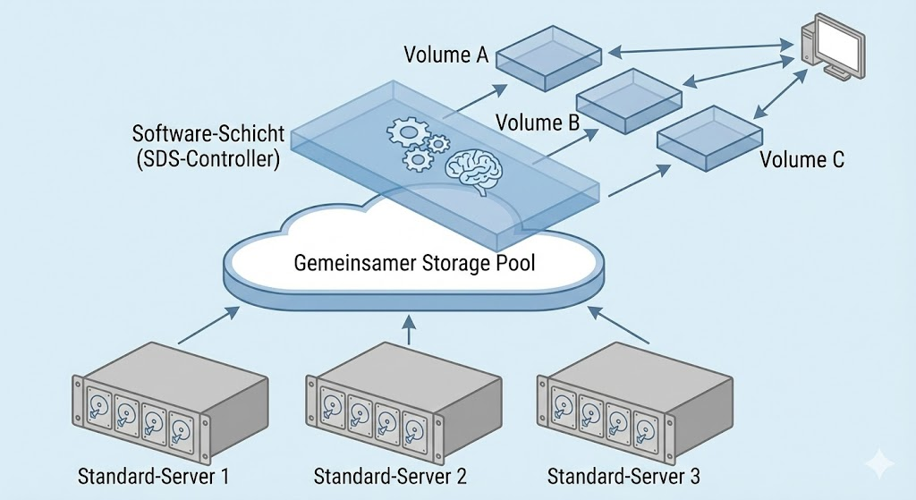 A paradigm shift is taking place here. Instead of buying expensive, proprietary hardware appliances, intelligence shifts completely to software. SDS solutions (such as VMware vSAN, Ceph or Microsoft Storage Spaces Direct) abstract the physical hard drives from standard servers (commodity hardware) and bundle them into a logical storage pool.