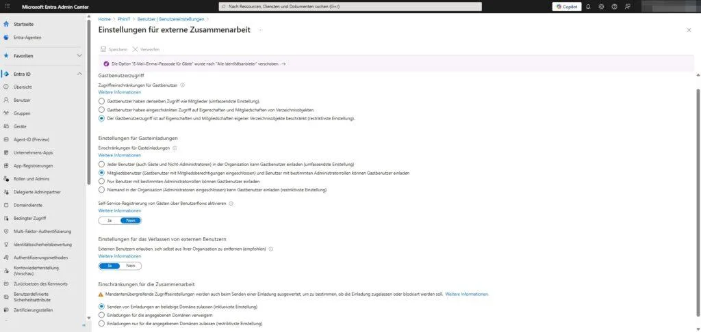 - Einstellungen für Gasteinladungen: → Nur Benutzer mit bestimmten Administratorrollen (oder deaktivieren).