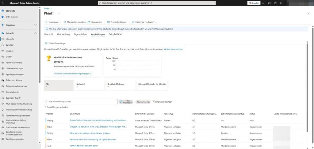 Der Menüpunkt Empfehlungen ist kein statischer Hilfetext, sondern eine aktive Analyse deiner Umgebung durch Microsofts KI. Das System vergleicht deine Konfiguration mit aktuellen Best Practices und Sicherheitsstandards.