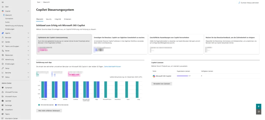 In der Übersicht steuerst du die Einführung (Adoption). Es reicht nicht, Lizenzen zuzuweisen; du musst validieren, ob und wie sie genutzt werden.