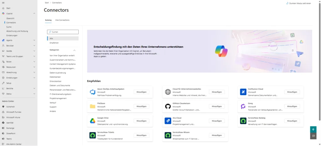 Im Admin Center findest du unter Copilot > Connectors einen Katalog mit vorgefertigten Schnittstellen zu populären Plattformen. Diese sind in Kategorien wie Entwicklungstools, CRM oder Dokumentenmanagement unterteilt.