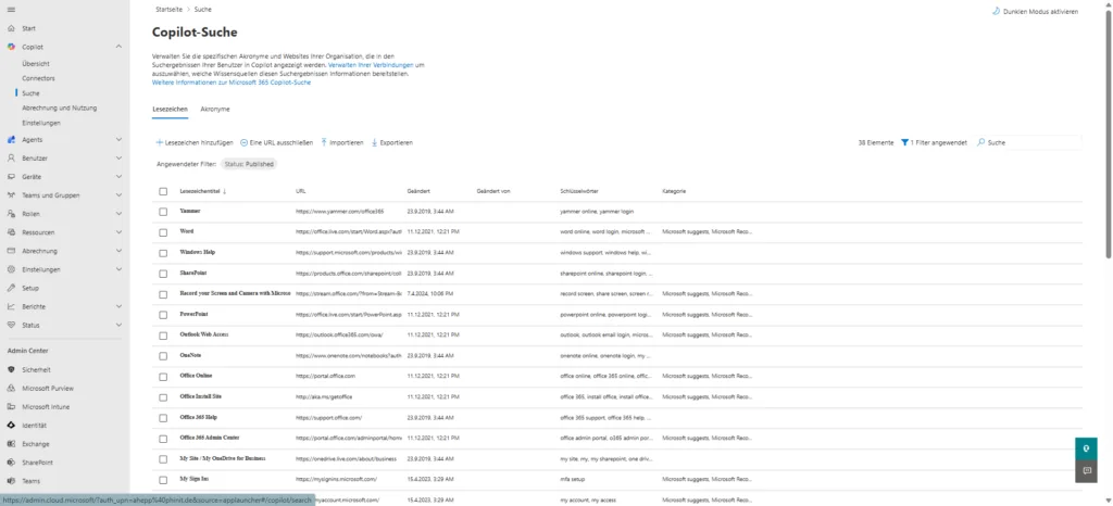 Lesezeichen leiten Nutzer direkt zu den offiziellen und vertrauenswürdigen Quellen deiner Organisation. Wenn jemand in Copilot nach einem bestimmten Dienst oder einer internen App fragt, erscheinen diese hinterlegten Links als bevorzugte Ergebnisse.