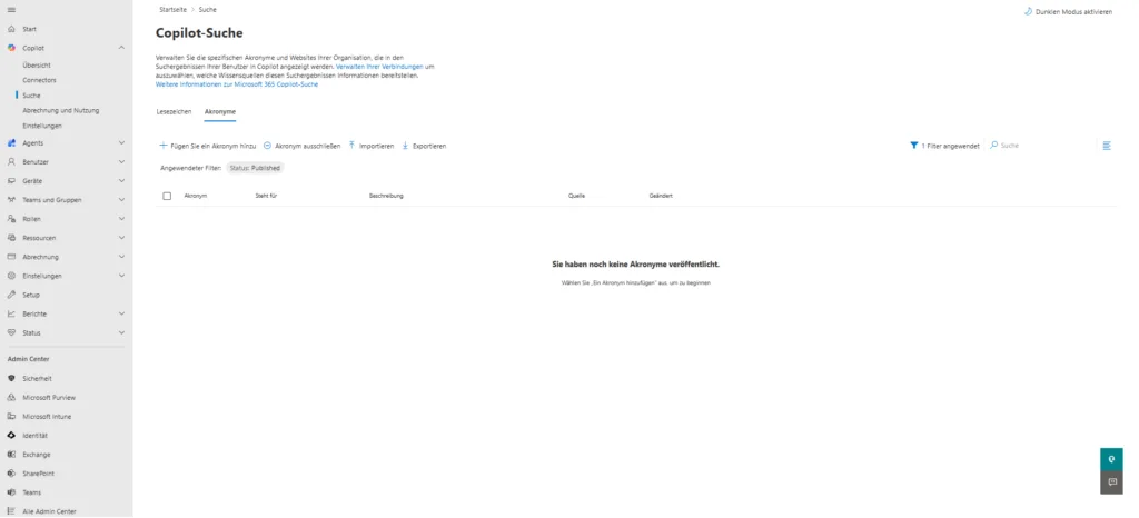 Damit Copilot die spezifische „Unternehmenssprache“ versteht und Abkürzungen korrekt auflösen kann, nutzt du den Bereich Akronyme.