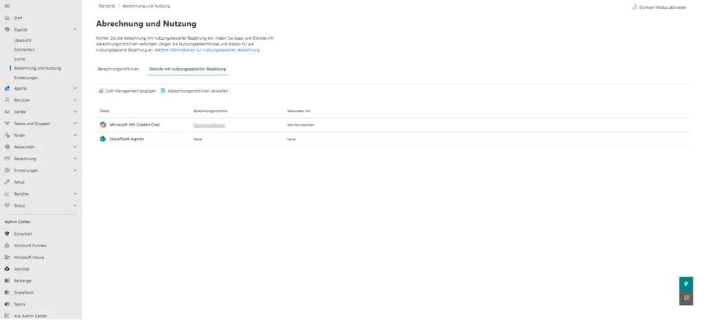 - Microsoft 365 Copilot Chat: Hier wird überwacht, welche Kosten durch die Nutzung der Chat-Funktionen entstehen, sofern diese über eine nutzungsbasierte Richtlinie laufen.