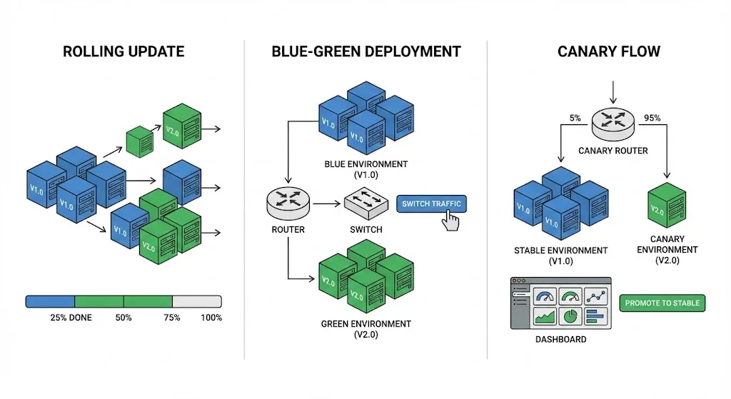 - Rolling Updates: Der Standard in Kubernetes. Schritt für Schritt werden alte Pods durch neue ersetzt. Die Anwendung bleibt durchgehend verfügbar, da immer nur ein kleiner Teil der Instanzen gleichzeitig aktualisiert wird.