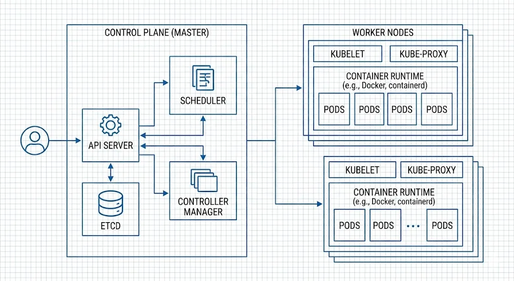 - Architektur: Kubernetes arbeitet mit einer Control Plane (früher Master-Node), die die Kontrolle übernimmt, und mehreren Worker-Nodes, die die Container ausführen. Auf der Control Plane laufen Komponenten wie der API-Server, die etcd-Datenbank, Controller und Scheduler. Worker-Nodes beherbergen die Container und verwalten diese über den Kubelet-Agenten.