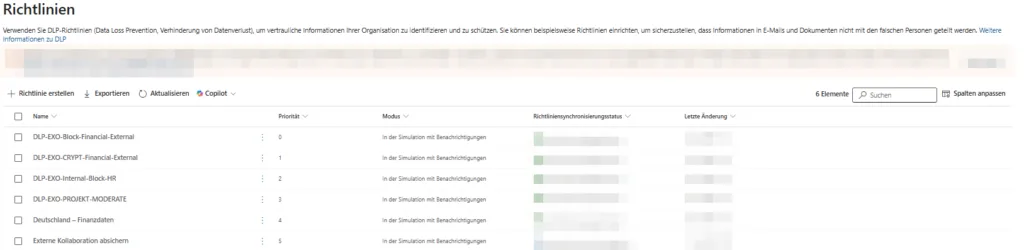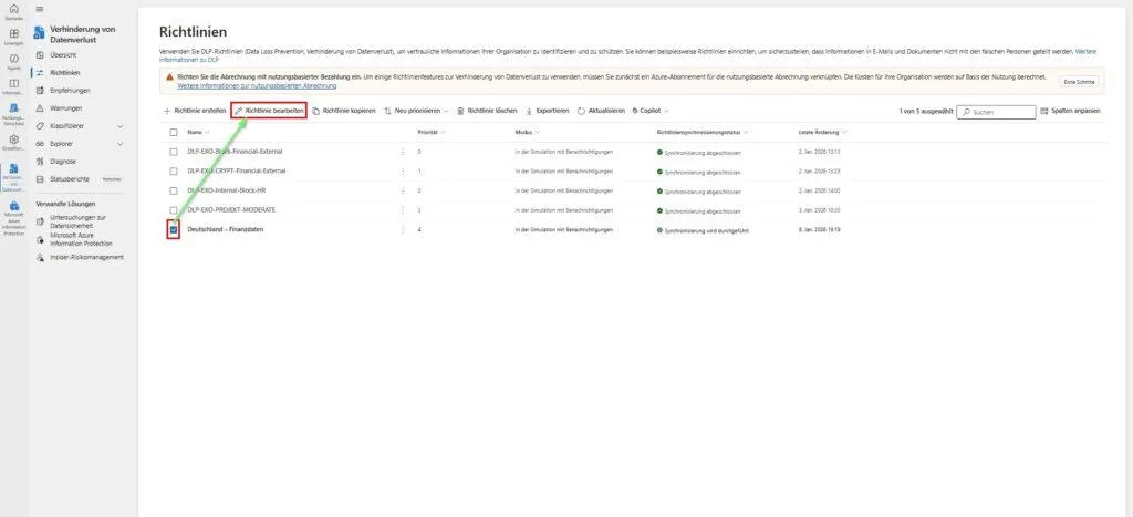 - Richtlinie öffnen: Wähle in der Übersicht (Data Loss Prevention > Richtlinien) deine gewünschte Richtlinie aus (nur anklicken, nicht den Namen klicken) und wähle in der Leiste oben „Richtlinie bearbeiten“.