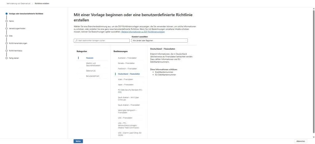 - Richtlinie erstellen: Starte im Purview Compliance Portal unter Data Loss Prevention > Richtlinien. Wähle nicht „Benutzerdefiniert“, sondern die Kategorie „Finanzwesen“. Das spart dir Zeit, da Microsoft hier bereits relevante SITs bündelt.