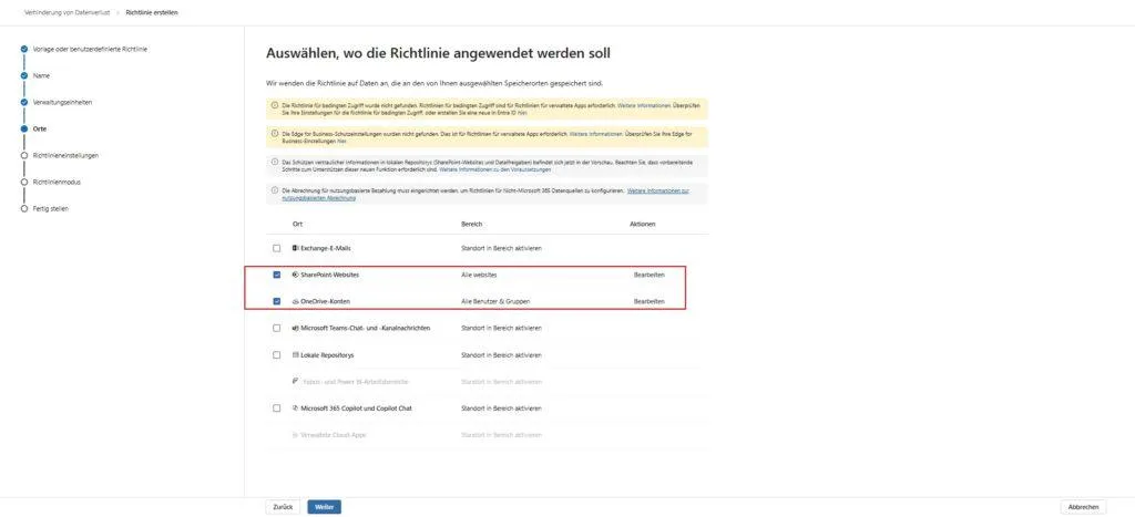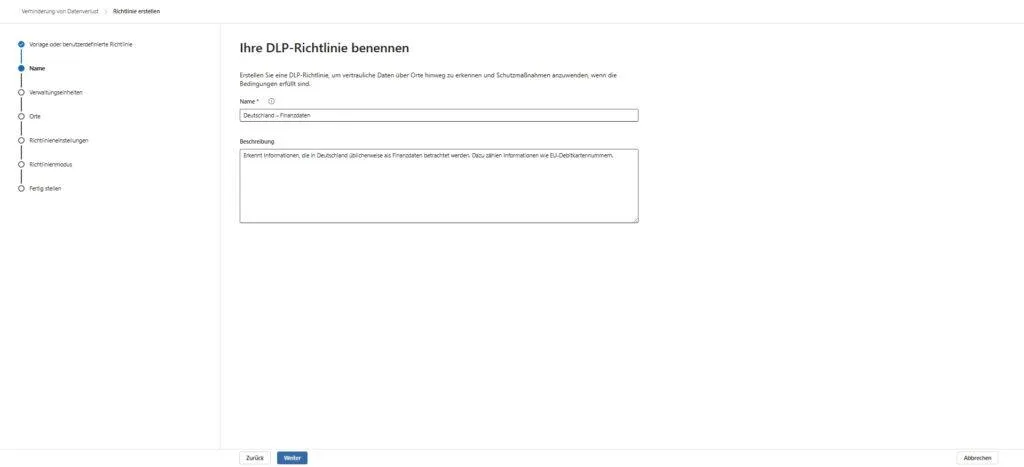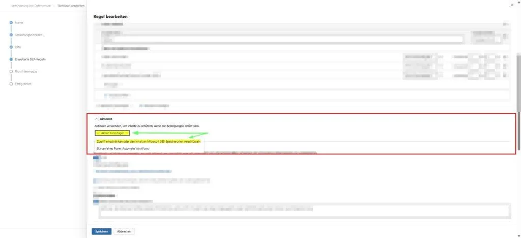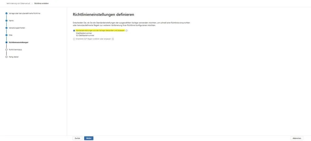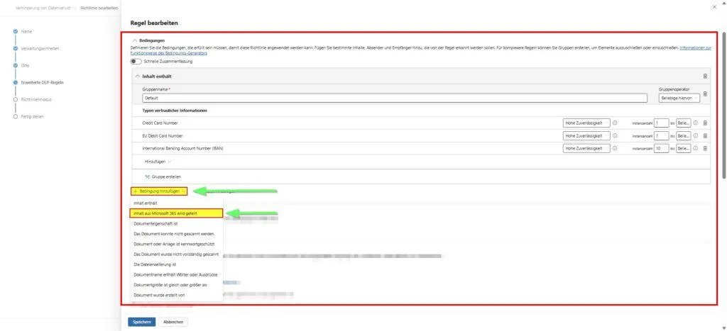 - Zur Regel navigieren: Klicke im Wizard auf „Weiter“, bis du zum Punkt „Erweiterte DLP-Regeln“ kommst.