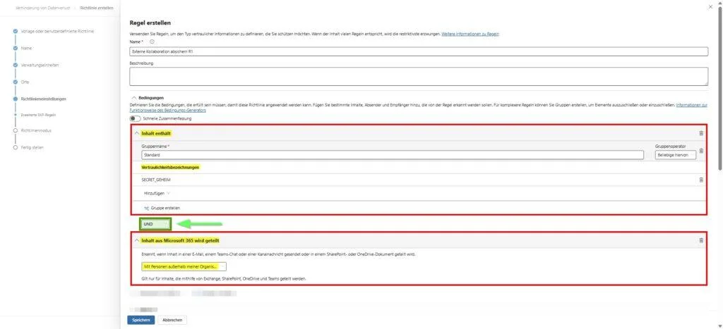 Anstatt Gastzugriffe pauschal zu verbieten (was zur Nutzung von Schatten-IT führt), konfigurieren wir eine DLP-Regel, die als selektiver Filter wirkt. Sie erlaubt Smalltalk und unkritische Dateien, blockiert aber strikt, sobald interne Klassifizierungen erkannt werden.