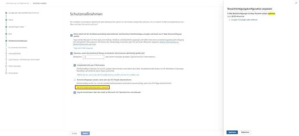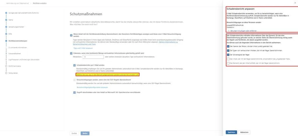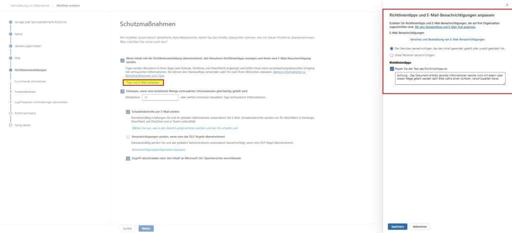 - Richtlinientipps & Benachrichtigungen: Setze den ersten Haken bei „Wenn Inhalt... übereinstimmt, den Benutzern Richtlinientipps anzeigen...“. Das ist essenziell für den Lerneffekt (siehe Szenario 3).