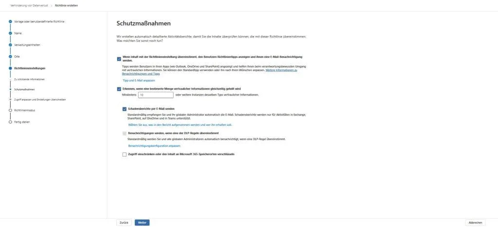 - Schutzmaßnahmen konfigurieren: Im Schritt „Schutzmaßnahmen“ definierst du die Reaktion des Systems. Hier verknüpfen wir die Technik mit der Nutzerpsychologie. Gehe die Haken von oben nach unten durch: