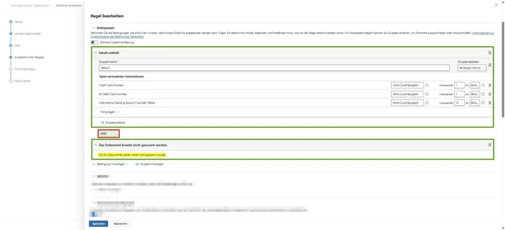 Die Konfiguration: Microsoft DLP bietet eine spezifische Bedingung für Anhänge oder Dateien, die nicht gescannt werden können (z.B. passwortgeschützt oder korrupt).