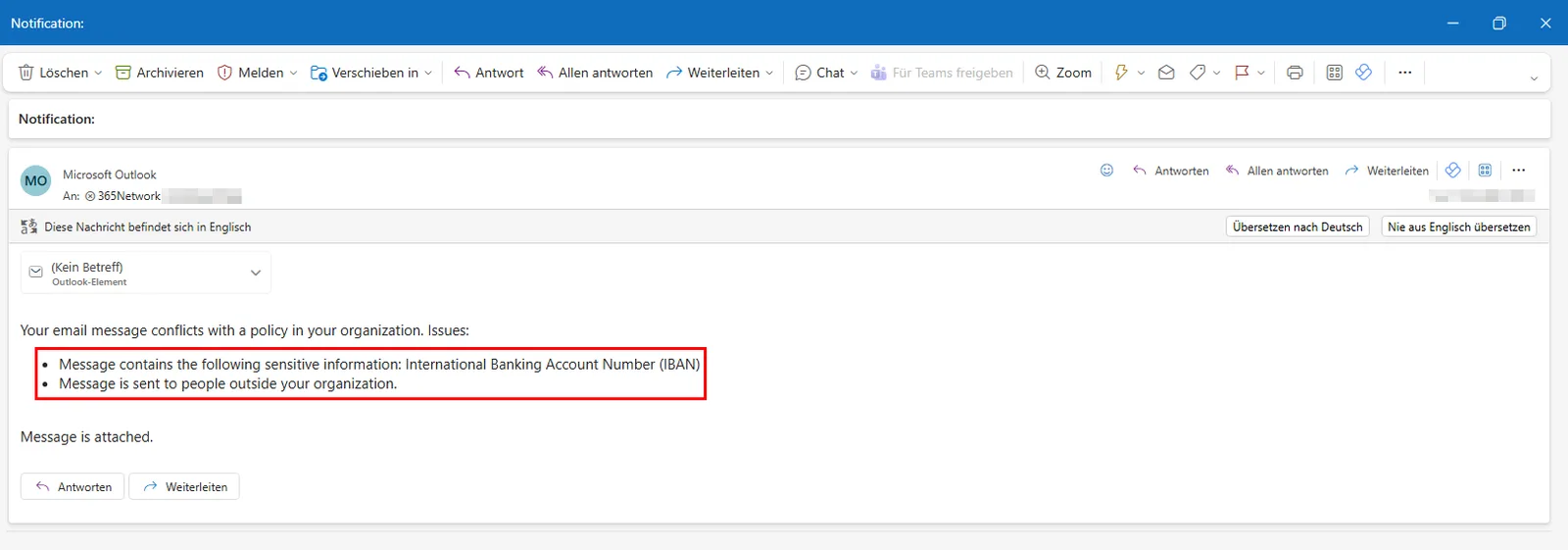 - Erweitere den Schutz auf IBANs (mit Vorsicht!) Kreditkarten sind wichtig, aber in Europa ist die IBAN das häufigste Ziel für Datendiebstahl. Füge daher den „Typen vertraulicher Informationen“ International Banking Account Number (IBAN) zu deiner Regel hinzu.