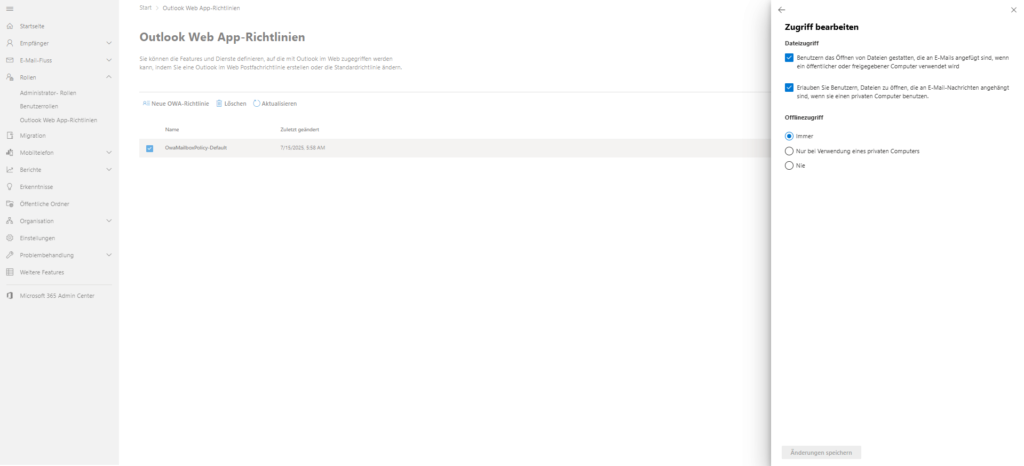 OwaMailboxPolicy-Default. - Adjust the File Access and Offline Access settings.