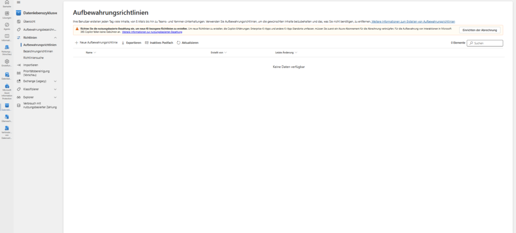 - GoBD Compliance: In the Microsoft Purview Portal (Data Lifecycle Management), define how long data must be retained (e.g. 6 or 10 years for tax-relevant mails).