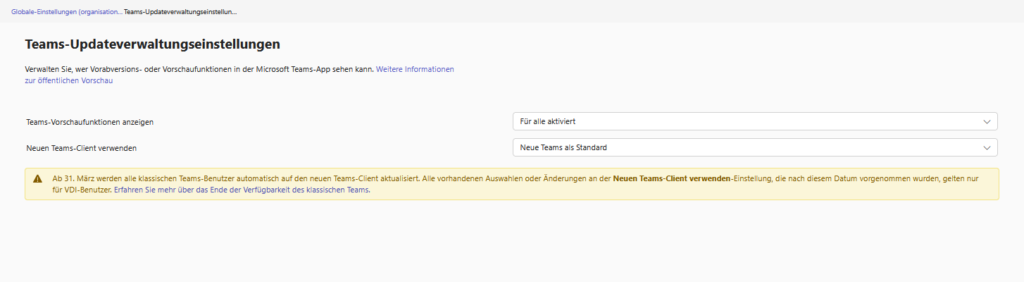 In this menu, you control the speed of innovation of your company. Here you determine whether your users have access to brand new features even before they are officially rolled out to everyone, and manage the (now almost complete) switch to the new Teams architecture.