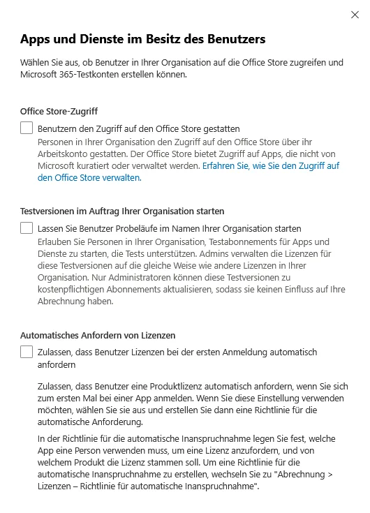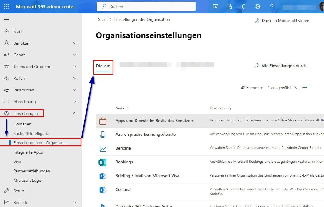 | MS365 | Admin Center | Einstellungen der Organisation – Dienste |